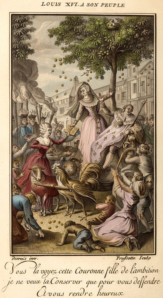 Olympe de Gouges présentant sa Déclaration à Marie-Antoinette et Louis XVI. Frontispice